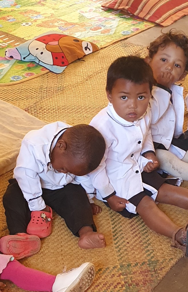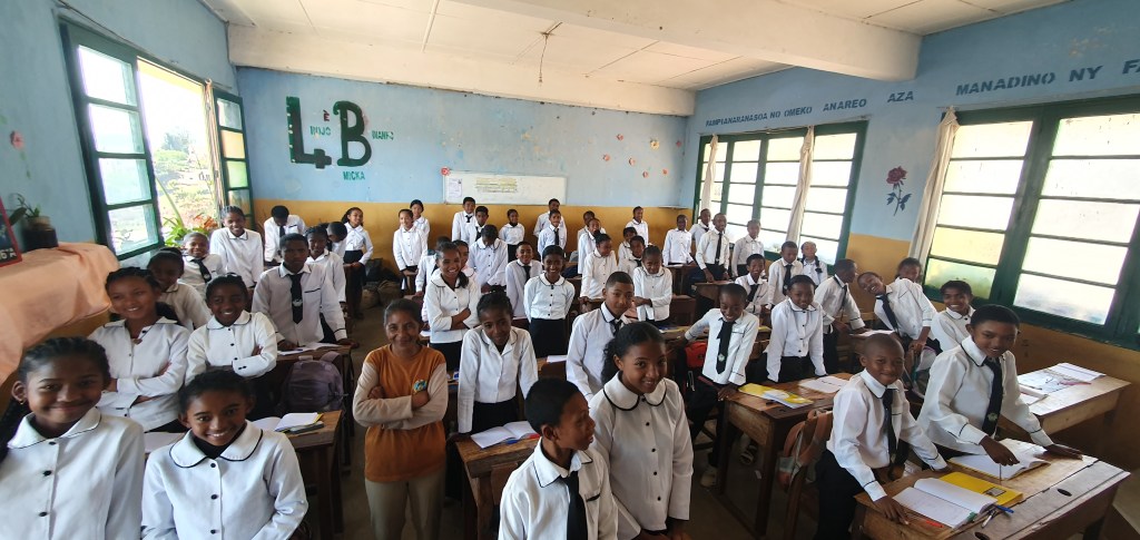 Aujourd’hui, après le mot de bienvenue de sœur Emma, directrice de l’établissement ( à droite de Bérangère) accueil chanté et dansé par le millier d’élèves du « collège » St Joseph d’AMBOHIMASAHOA avant une visite de l’établissement du pré scolaire à la classe de 3ème.